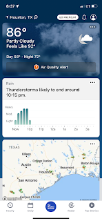 The day was hot, partly cloudy, and mostly dry. The sky looked to be clear, during the early and mid-morning, and night. The sky looked to have become partly cloudy, during the late morning and remained partly cloudy through the evening. The sky looked to have become clear sometime during the early or late night. It felt warm, during the early morning and night. It felt very warm, during the mid-morning and late evening. It felt hot, during the late morning, afternoon, and early evening. The wind speeds looked to be light with maybe some moderate and moderately strong gusts, during the morning, afternoon, evening, and night. There were a few or more isolated moderately heavy to heavy thunderstorms to the north of the Houston, TX area that moved south into the Notthern areas of Houston, TX bringing rain to my house in the Copperfield area and others, during the late evening and early night. That was the only rain that I saw or witnessed during anytime of the day or night.