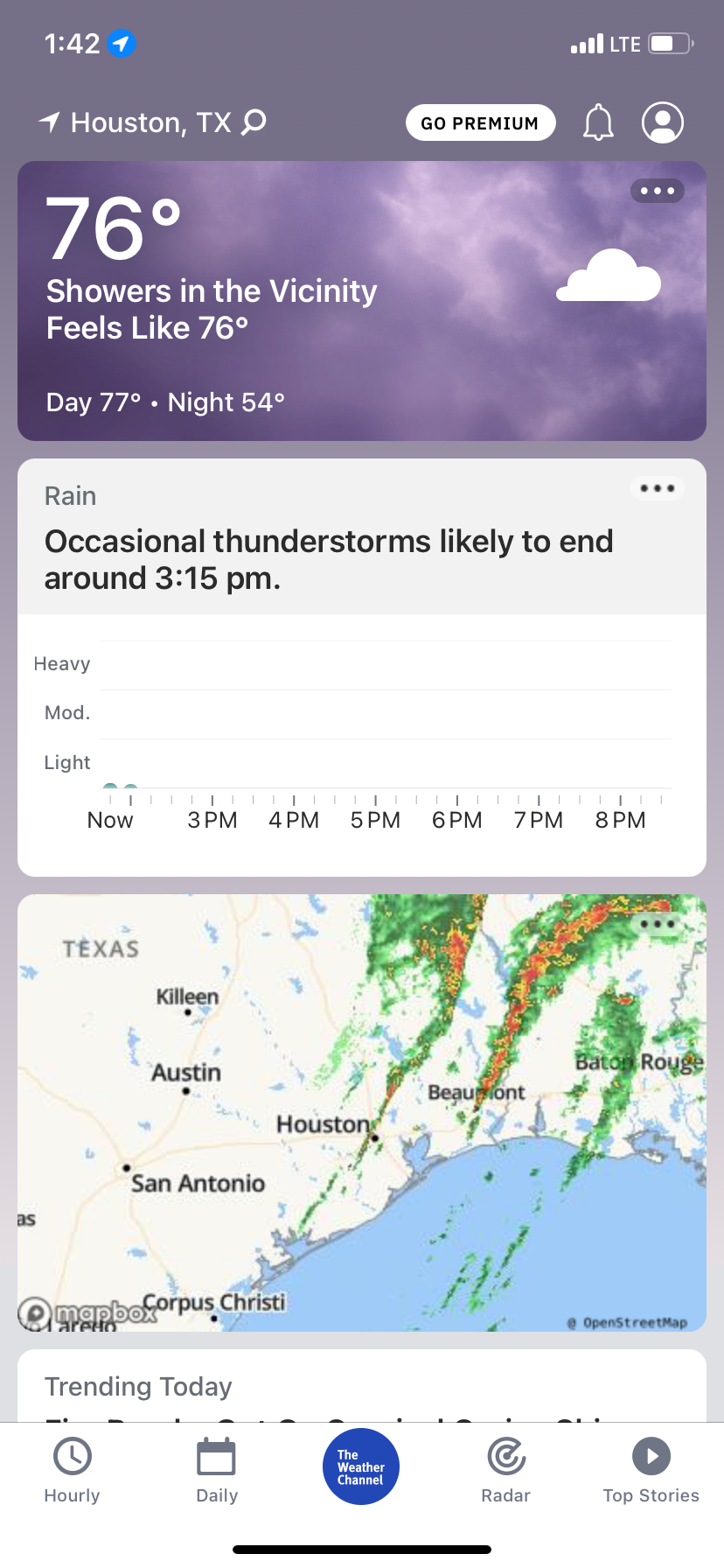 The day was mostly cloudy, warm, and dry. The sky looked to be partly cloudy, during the early and mid-morning. The sky looked to have become mostly cloudy, during the late morning or early afternoon and stayed mostly cloudy through the mid and late afternoon, evening, and night. It felt warm, during the morning, afternoon, evening, and night. The wind speeds looked to be light with moderate and moderately strong gusts, during the morning, afternoon, evening, and night. I did not see any chances for rain for the Houston, TX area, during the day, or night. I did not see any rain on the Houston, TX radar, during the day, or night. I did not witness any rain where I was in the Houston, TX area, during the day, or night.